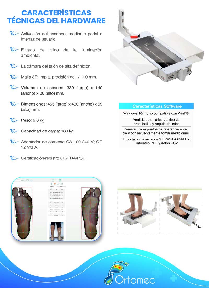 Aplicaciones: ortopedia, rehabilitación física, deporte, medicina laboral y uso en la vida diaria. La idea es que el escáner permita mejorar diagnósticos y tratamientos en condiciones como fascitis plantar, pie diabético, metatarsalgias, pie plano, etc.