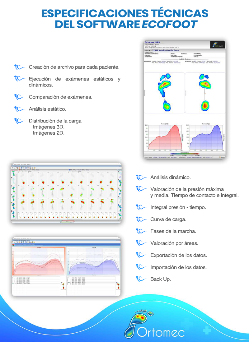 Software: incluye creación de archivo por paciente; exámenes estáticos y dinámicos; comparación entre exámenes; análisis estático (distribución de carga, imágenes 2D/3D) y dinámico (presión máxima, presión media, tiempo de contacto, fases de la marcha, etc.).